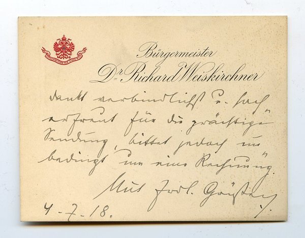 1 S. Qu.-kl.-8vo. Mit eh. adr. Kuvert. An einen Josef Stehlik im Landwirtschaftsamt. Bürgermeister Dr. Richard Weiskirchner (dies gedruckt) "dankt verbindlichst u. hocherfreut für die prächtige Sendung, bittet jedoch unbedingt um eine Rechnung". - Der aus Wien stammende Politiker war von 1912 bis 1919 Bürgermeister von Wien. 1919 in die Konstituierende Nationalversammlung gewählt, war er anschließend bis 1923 Abgeordneter zum Nationalrat, von 1920 bis 23 auch dessen Präsident. Weiskirchner veröffentlichte u. a. "Österreichische Städteordnungen" (1895) und "Kartellwesen vom Standpunkt der christlichen Wirtschaftsauffassung" (1896). - Auf Briefpapier mit gepr. Vignette; etwas angestaubt und gebräunt.