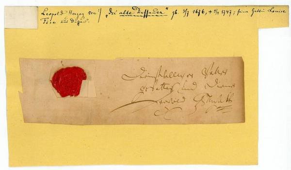 1 S. Ca. 195:58 mm. Mit rotem Lacksiegel. Dienstwilliger Vetter / Gevatter und Diener / Leopold zu Anhalt. - Genannt "der Alte Dessauer", war Leopold der erste wichtige preußische Heeresreformer und einer der populärsten preußischen Generäle.