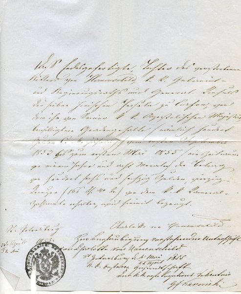 1 S. 4to. Daß Endesgefertigte, Tochter des verstorbenen Ritters von Hauenschild, k.k. Gubernial- und Regierungsraths und General Konsuls der sieben Ionischen Inseln zu Corfou, von dem ihr von Seiner k.k. Apostolischen Majestät bewilligten Gnadengehalte [.] den Betrag von hundert sechs und sechzig Gulden, vierzig Kreuzer (166fl 40 kr) von dem k.k. Kameralzahlamte erhalten, wird hiermit bezeugt [.]. - Mit einer weiteren U. von Gf. Karnicki (wohl Jan Karnicki, 1813-1879) sowie mit Stempel der österreichischen Gesandtschaft in St. Petersburg; mit kleineren Randläsuren.