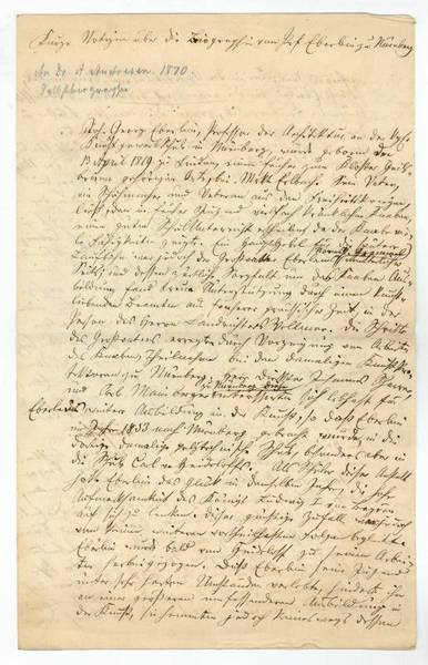 3½ SS. auf Doppelblatt. Folio. Manuskript zu einem autogbiographischen Lebenslauf, der - so von anderer Hand in Bleistift vermerkt - an einen Dr. Andresen versandt wurde: "Joh. Georg Eberlein, Professor der Architektur an der Kgl. Kunstgewerbeschule in Nürnberg, wurde geboren den 13 April 1819 zu Linden, einem früher zum Kloster Heilsbronn gehörigen Orte, bei Markt Erlbach. Sein Vater, ein Schuhmacher und Veteran aus den Freiheitskriegen, ließ dem in früher Jugend vielfach kränklichen Knaben einen guten Schulunterricht ertheilen, da der Knabe viele Fähigkeiten zeigte. Ein Haupthebel für die spätere Laufbahn war jedoch der Großvater Eberlein [.]".