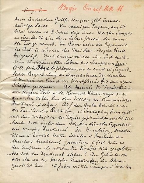 10½ SS. auf 11 num. Bll. Gr.-4to. Dem Andenken Gottfr. Sempers gilt unsere heutige Feier. Vor wenigen Tagen, am 15t. Mai waren es 8 Jahre daß unser Meister Semper in der Stadt aus dem Leben schied, die man die Ewige nennt. In Rom neben der Pyramide des Cestius wurden des Meisters irdische Reste beigesetzt. Nach einem reichen aber auch mühsam durchkämpften Leben hat Semper an dem Ort seine Tage beschlossen, wo er einst in jugendlicher Begeisterung an den erhabenen Denkmalen u. Werken der Kunst die Richtschnur für sein eigenes Schaffen gefunden [.]. - Georg Lasius studierte u. a. am Zürcher Polytechnikum unter Gottfried Semper, lehrte dort seit 1862 und erhielt 1867 eine Professur. Zu seinen praktischen Arbeiten zählen das Chemie- und das Physikgebäude des Eidgenössischen Polytechnikums (1886 bzw. 1889, zusammen mit Alfred Friedrich Bluntschli) oder das Atelierhaus von Arnold Böcklin in Zürich (1885). - Etwas gebräunt und mit kleinen Läsuren.