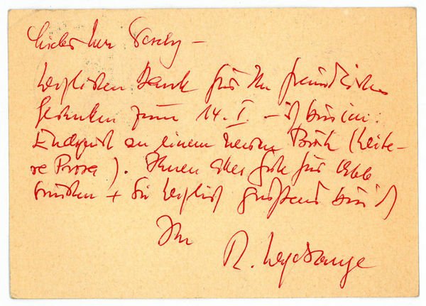 1 S. Qu.-8vo. Mit eh. Adresse. Dankt Josef Wesely für ihm übersandte Geburtstagswünsche: “[.] ich bin im Endspurt an einem neuen Buch (heitere Prosa) [.]”. - Hagelstange war während der Zweiten Weltkriegs als Redakteur von Soldatenzeitungen in Paris, Rom, Verona und Venedig eingesetzt, wo auch der erste Teil seines Sonett-Zyklus ‘Venezianisches Credo’ entstand, dessen Publikation 1946 ihm rasch zu anhaltender Popularität verhalf. Von Ost- und Westdeutschland gleichermaßen umworben, bereiste er ganz Deutschland auf Lesereisen und ließ sich nach kurzer Tätigkeit im "Kulturbund zur demokratischen Erneuerung" in der Sowjetischen Besatzungszone endgültig im Westen nieder. Bis Ende der sechziger Jahre spielte er als “begabter Redner und Organisator [.] eine führende Rolle im westdeutschen Literaturbetrieb” (DBE) und veröffentlichte erfolgreich Reiseimpressionen, Übersetzungen und Romane, “die von der Kritik wegen ihres verharmlosenden Umgangs mit der deutschen Geschichte [zur] Zeit des Nationalsozialismus jedoch verrissen wurden” (ebd.). Vgl. auch Kosch VII, 107ff.