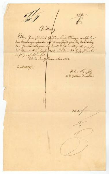 ½ S. Folio. Bestätigt den Erhalt von 200 Gulden "zur Bestreitung der Handauslagen bei der k. k. Gemäldegallerie für das Verwaltungsjahr 1856". - Der aus Hanau gebürtige Genre-, Historien- und Portraitmaler war seit 1828 Direktor der kaiserlichen Gemäldegalerie und Schlosshauptmann des Schlosses Belvedere in Wien. - Mit einigen Randläsuren und Registraturvermerken.