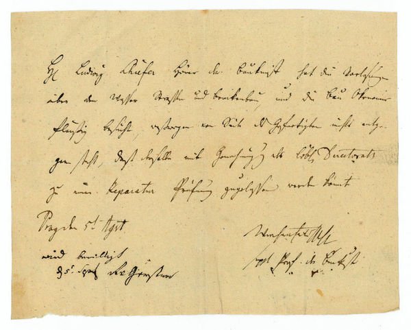 1 S. Qu.-8vo. “Herr Ludwig Chufer [?] Hörer der Baukunst hat die Vorlesungen über die Wasser Straße und Brückenbau, und die Bau Okonomie fleißig besucht, weswegen von Seite des Gefertigten nichts entgegensteht, daß derselbe mit Genehmigung des löbl. Directorats zu einer Reparatur Prüfung zugelassen werden könnte [.]”. - Wiesenfeld war seit 1828 am Prager polytechnischen Institut tätig. “In das Programm seiner Vorträge hatte Wiesenfeld außer der bisher üblichen bürgerlichen Baukunst noch die Eisenbahnbauten, die Eisenconstructionen, die neuen Brückensysteme, ferner als vorbereitende und ergänzende Elemente die Bauökonomie und die neuen Gewölbstheorien aufgenommen [.]” (Wurzbach, s. v.). - Mit einem Aktenvermerk von fremder Hand.
