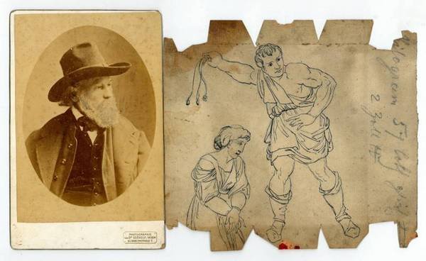 1 Bl. 172 x 156 mm. Beiliegend Kabinettphotographie. Mit Tinte ausgeführte Bleistiftskizze mit Geißelungsszene. Auf dem unbeschriebenen Gegenblatt eines Faltbriefs (Siegel- und Öffnungsspuren; angestaubt und fleckig; mit zeitgenössischen Bleistiftnotizen). Beiliegend Portraitaufnahme aus dem Atelier Dr. Székely, Wien, auf Kartonträger (105 x 164 mm).