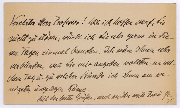 1½ SS. Großes Visitkartenformat. An einen Hrn. Professor: "Wenn ich hoffen darf, Sie nicht zu stören, würde ich Sie sehr gerne in diesen Tagen einmal besuchen. Ich wäre Ihnen sehr verbunden, wenn Sie mir angeben wollten, an welchem Tag u. zu welcher Stunde ich Ihnen am wenigsten ungelegen käme [.]".