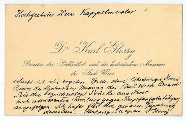 1 S. Visitkartenformat. An einen Kapellmeister mit der Bitte, "dem Überbringer Herrn Custos des Historischen Museums der Stadt Wien Eduard Seis die bezeichneten Stücke aus Ihrer hoch interessanten Sammlung gegen Empfangsbestätigung auszufolgen [.]. - Seit 1882 als Kustos der Wiener Stadtbibliothek tätig, war Karl Glossy von 1890-1904 als deren sowie als Leiter des Historischen Museums tätig. Zusammen mit August Sauer gab er 1879 eine Gesamtausgabe der Werke Ferdinand Raimunds heraus und veröffentlichte zahlreiche literatur- und theaterhistorische Arbeiten, die sich durch die hier erstmals zugrundegelegten präzisen Archivforschungen auszeichnen. Als Museumsdirektor gestaltete er u. a. Ausstellungen über Franz Grillparzer und Franz Schubert. Der Vater der Schauspielerin und Diseuse Blanka Glossy war Mitbegründer der Grillparzergesellschaft und redigierte auch lange Zeit deren Jahrbuch; seit 1904 war er zudem Mitherausgeber der "Österreichischen Rundschau".