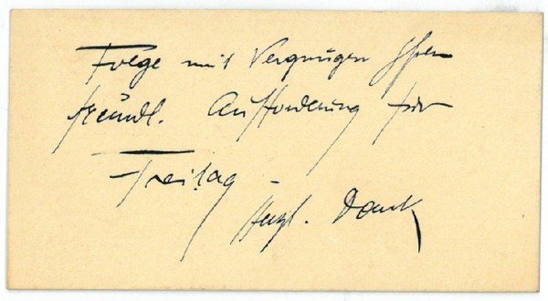 1 S. 40 x 78 mm. Folge mit Vergnügen Ihrer freundl. Aufforderung für Freitag.