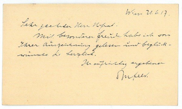 65 x 112 mm. Mit besonderer Freude habe ich von Ihrer Auszeichnung gelesen und beglückwünsche Sie herzlich (wohl Josef Wiesel zu seiner Ernennung zum Vorstand der 1. Medizin. Abteilung im Kaiser-Franz-Joseph-Spital).