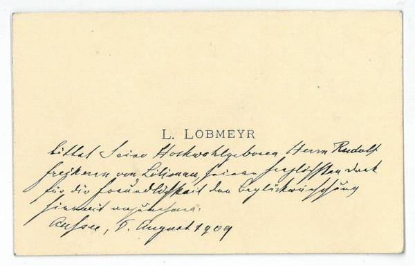 70 x 110 mm. [L. Lobmeyr] bittet Seine Hochwohlgeboren Herrn Rudolf Freiherrn von Lilienau, seinen herzlichesten Dank für die Freundlichkeit der Beglückwünschung hiermit anzunehmen […]. - Nach einer gründlichen Ausbildung trat Lobmeyr 1859 in die Firmenleitung der väterlichen Glaswarenfabrik in Wien ein und wurde nach dem Tod seines Bruders 1864 Alleininhaber. In Zusammenarbeit mit dem Österreichischen Museum für Kunst und Industrie sowie mit vielen zeitgenössischen Künstlern bemühte sich Lobmeyr vor allem um die künstlerische Gestaltung seiner Glaswaren sowie um Qualitätsverbesserungen. Auf der ersten Internationalen Elektrizitätsausstellung in Wien 1883 präsentierte er die ersten elektrischen Kristallüster.