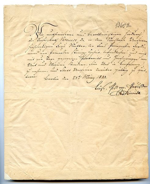 ½ S. auf Doppelblatt. 4to. Wir authorisiren und bevollmächtigen hiedurch den Justizrath Krause, die in dem Nachlasse Unserer hochseeligen Mutter, der Frau Prinzessin Ferdinand von Preußen König[liche] Hoheit, befindlichen, und nicht mit zur Taxe gezogenen Portraits und Zeichnungen von Uns und Unsern Lindern, für Uns in Empfang zu nehmen, und Statt Unserer darüber gültig zu quittiren [.]. - Papierbedingt etwas gebräunt; größere Einrisse in den Faltungen alt hinterlegt; zahlreiche kleine Randläsuren und Knitterspuren.