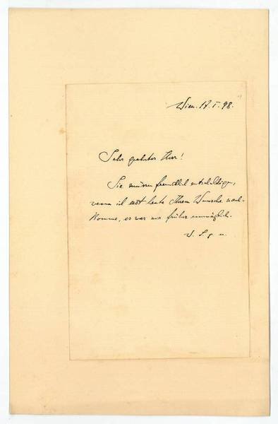 2 SS. auf gefalt. Doppelblatt. 8vo. Auf Trägerkarton montiert. An einen namentlich nicht genannten Adressaten: "Sie müssen freundlich entschuldigen, wenn ich erst heute Ihrem Wunsche nachkomme, es war mir früher unmöglich". Auf dem 2. Blatt: "Tapfer sich zeigen | Nimmer sich beugen | Führet die Arme der Götter herbei! (Goethe)".