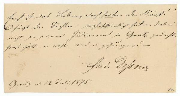 1 S. Qu.-8vo. Ernst ist das Leben, doch heiter die Kunst! sagt der Dichter: wahrscheinlich hat er dabei nicht an einen Julimonat in Gratz gedacht, sonst hätte er wohl anders gesungen! […]. - Der Sohn Ludwig und Therese Dessoirs wurde zunächst von den Eltern ausgebildet und erhielt später Unterricht von Friedrich Werner in Mannheim. Er debütierte 1852 in Freiburg/Breisgau, spielte später in Meißen, Glogau, Mainz, Heidelberg, Stettin und Leipzig (1857-61), ging anschließend nach Bremen und führte 1863/64 in Weimar erstmals auch Regie. Seit 1864 am Kgl. Schauspielhaus Berlin tätig, ging er über Weimar nach Breslau und trat 1870 dem Verband der Hofbühne in Dresden bei. Dessoir pachtete 1877 das Breslauer Residenztheater, versuchte sich erfolglos als Theaterdirektor, kehrte 1880 am Prager Landestheater auf die Bühne zurück und spielte 1885-89 am Hoftheater St. Petersburg; seit 1889 gab er in Dresden Schauspielunterricht.
