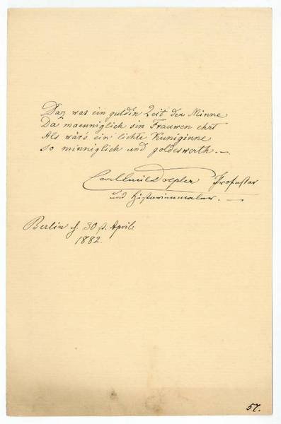 ½ S. 8vo. Das was ein guldin Zeit der Minne / Da maenniglich sin Frauwen ehrt / Als wär's ein lichte Kuniginne / so minniglich und goldeswerth. - Döpler war Lehrer und seit 1889 Professor an der Unterrichtsanstalt des Kunstgewerbemuseums in Berlin. Besondere Bedeutung erlangte er als kunstgewerblicher Zeichner. "In großer Zahl entstanden Entwürfe zu Glasgemälden, Metallarbeiten, Adressen, Diplome, Exlibris (z. B. f. Kaiser Wilhelm II.) und, im Auftrag des kgl. Hauses zu Berlin, für Drucksachen des Hofes, Gold- und Silberarbeiten (die kgl. Krone), für die Thronneubauten im Weißen und im Rittersaal des kgl. Schlosses etc." (Thieme/Becker IX, 366).