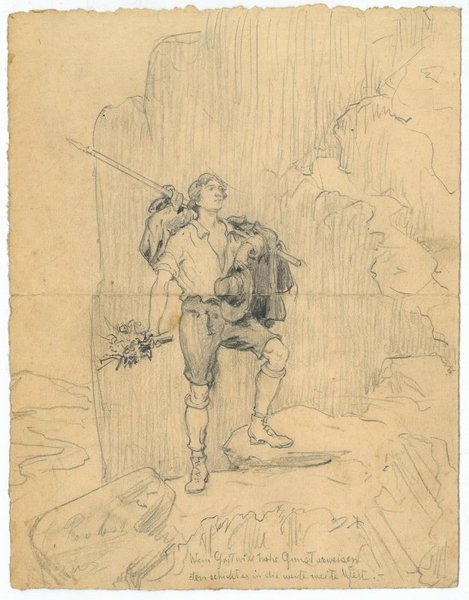 1 S. 4to. Wanderer in den Bergen mit Stock und Blumen. Am unteren Bildrand: "Wem Gott will hohe Gunst erweisen, den schickt er in die weite weite Welt". Auf der Rückseite gedr. Ankündigung der Verlobung von Adolf Koenig und Agnes Fischer. - Karl Probst studierte an der Akademie der bildenden Künste in Wien und "wandte sich nach anfänglicher Vorliebe für das Genrebild der Porträtmalerei zu, in der er es zu großer Beliebtheit brachte [.] Als Mitglied der Genossenschaft der bildenden Künstler Wiens (Künstlerhaus) stellte Probst 1874-94 vorwiegend Genrebilder, ab 1881 auch Portraits aus, die sich (bei genrehaft aufgefaßtem Hintergrund) durch Lebendigkeit und Wahrheitstreue auszeichnen [.]" (ÖBL VIII, 289).