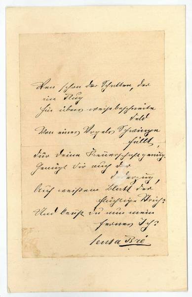 1 S. 8vo. auf Trägerkarton. Wenn schon der Schatten, der im Flug | Hin über's weißbeschneite Feld | Von eines Vogels Schwinge fällt, | Für deine Kennerschaft genug. | Genügt dir auch der Federzug, | Auf weißem Blatt der flüchtige Strich? | Und kennst du nun mein fernes Ich?