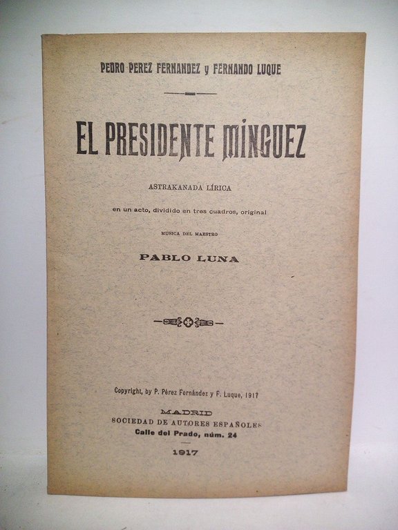 El Presidente Mínguez. (Astrakanada lírica en un actom dividido en tres cuadros, original. Estrenada en el Teatro de Apolo, el día 13 de Junio de 1917)