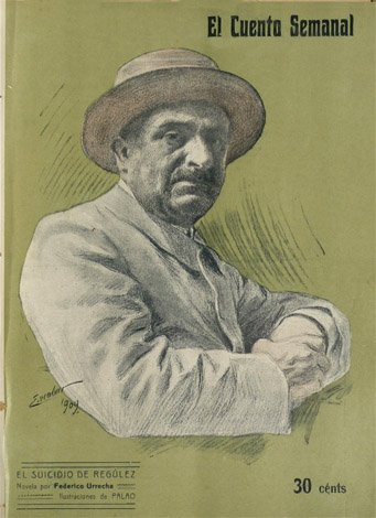 Madrid, El Cuento Semanal, 1909. Folio; 10 hs. sin paginar, impresas a doble columna y con ilustraciones entre el texto de Palao. Cubiertas originales de Escobar.