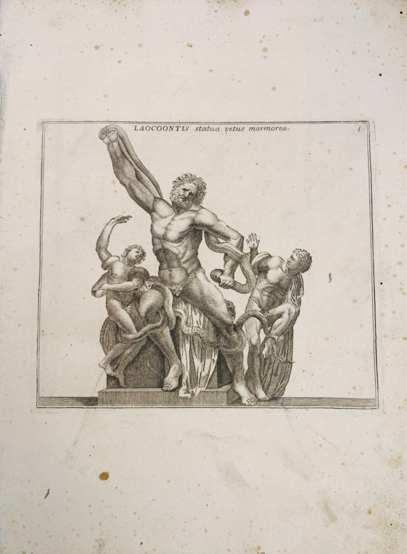 >in-4 (mm.278x208), pp XVI, e 38 tavole (su 42) incise in rame. Titolo inciso entro elaborata cornice ornamentale. Legatura mezza pergamena, titolo ms al dorso. Lavoro di tarlo nel margine inferiore interno bianco. Raccolta di tavole incise in rame raffiguranti celebri staue dell'antica Roma inclusa quella di Laocoonte ed i suoi fratelli. Esemplare scompleto delle tavole : 7-14-25-27. Qualche fioritura e brunitura alle tavole 33-5.