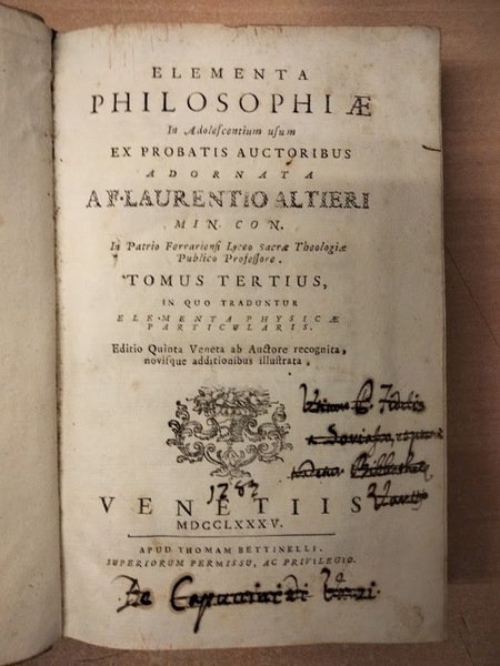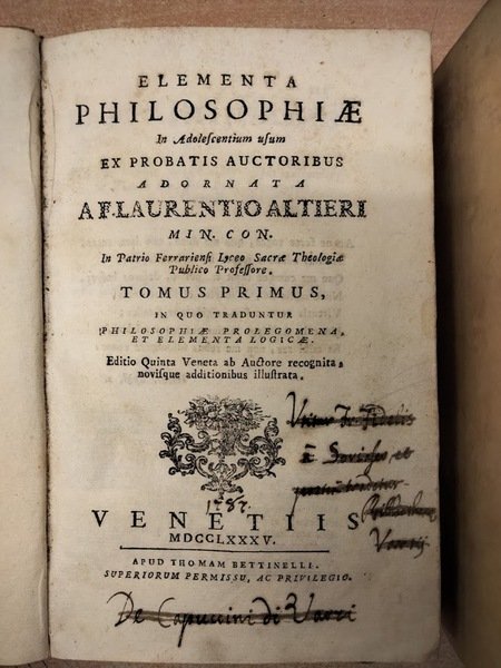 Elementa philosophiae in adolentium usum probatis auctoribus. In quo traduntur philosophiae prolegomena et elementa logicae. Editio quinta veneta ab auctore recognita, novisque additionibus illustrata.