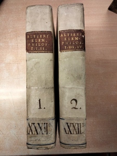 3 tomi su 2 voll. , in 16°, p. perg. , pp XX + 202 + c. nn. + 4 tavv. n. f. t. ( 1° tomo) + XVI + 376 + 5 tavv. n. f. t. ( 2° tomo) + XVI + 552 + 11 tavv. n. f. t. ( 3° tomo). Testate e capilettera. Menda sui front. ( appunti manoscritti e cancellati). Lettere ai d. in oro.