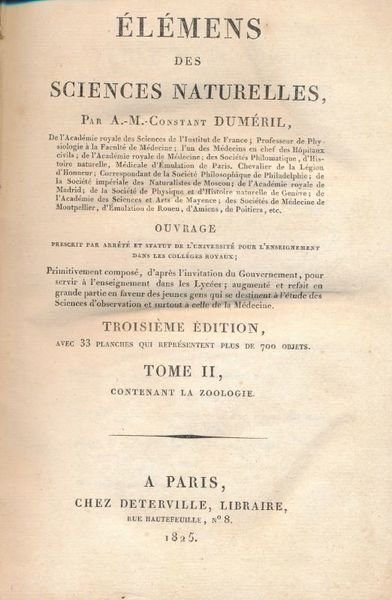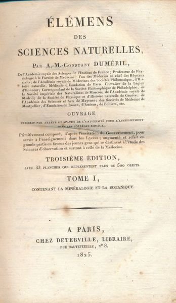 chez Deterville 1825 A Paris, chez Deterville, 1825. 2 volumes in-8 plein cartonnage bleu de l'époque, xxviii + 351 + xxxii + 391 pages. Bien complet des 33 planches dépliantes représentant plus de 700 objets. Quelques petites rousseurs, coiffes un peu frottées, néanmoins très bon exemplaire. Tome 1 : Minéralogie - Botanique. Tome 2 : Zoologie. Bon état