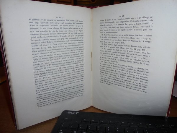 Dottore Carlo Demaria. Torino, Tipografia Mussano, 1846. Elogio Storico di LUIGI ROLANDO. In-8° grande, cartone coevo con bordure dorate sui piani. 53 pp. Raro opuscolo in prima edizione. Ben conservato. Uff. A - II -3 - 2