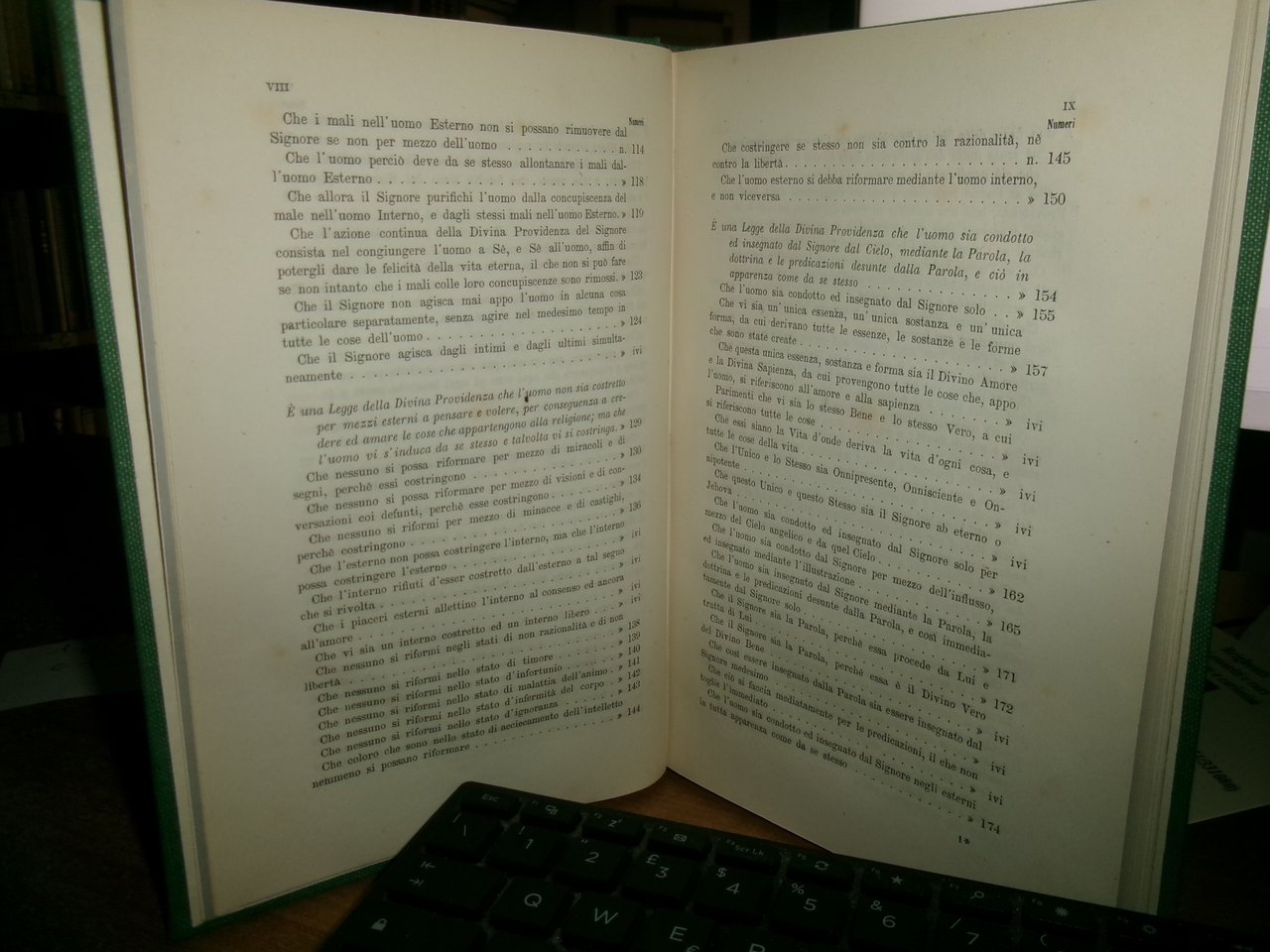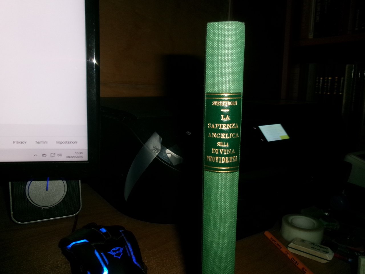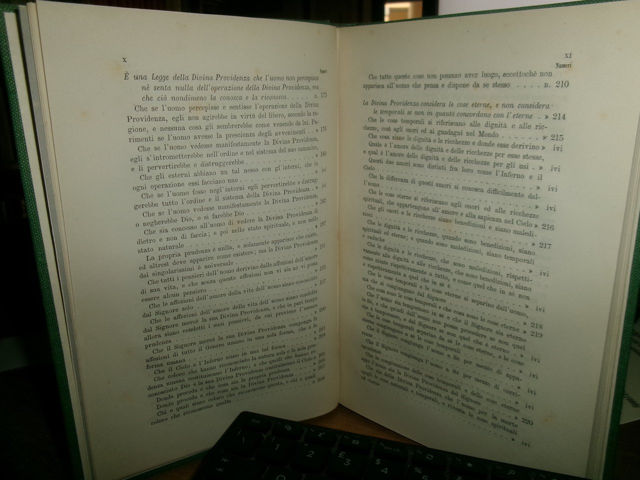 EMANUELE SWEDENBORG. La Sapienza Angelica sulla DIVINA PROVIDENZA. Traduzione dal Latino eseguita sull' edizione Tafel (Tubinga 1835) dal Prof. Loreto Scocia. Torino, Tipografia Fodratti, 1874. In-8°, tela verde con titolo in oro entro tassello al dorso, brossure originali conservate. XX, 294, (4) pp. Bell' esemplare in legatura recente con le brossure originali conservate. Neg. esot. mob. 60