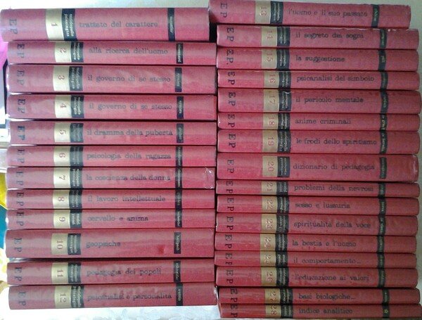 Edizioni Paoline, 1960. In-8, opera completa in 28 volumi. In ottimo stato Vol. 1: Mounier Emanuele - Trattato del carattere. Vol. 2: Missenard Andre' - Alla ricerca dell'uomo. Vol. 3: Eymieu Antonio - Il governo di se stesso. (Parte I). Vol. 4: Eymieu Antonio - Il governo di se stesso. (Parte II). Vol. 5: Gruber Alois - Il dramma della puberta'. Vol. 6: Mendousse Pietro - Psicologia della ragazza. Vol. 7: Clostermann Gerhard - La coscienza della donna. Vol. 8: Guitton Jean - Il lavoro intellettuale arte nuova di pensare. Vol. 9: Laubenthal Florin - Cervello e anima. Vol. 10: Hellpach Willy - Geopsiche. Vol. 11: Schneider Friedrich - Pedagogia dei popoli. Vol. 12: Nuttin Giuseppe - Psicanalisi e personalita'. Vol. 13: Pfahler Gerhard - L'uomo e il suo passato. Vol. 14: Meseguer Pedro - Il segreto dei sogni. Vol. 15: Poll Wilhelm - La suggestione. Vol. 16: Baudouin Charles - Psicanalisi del simbolo religioso. Vol. 17: Verdun Maurizio - Il pericolo mentale. Vol. 18: De Greeff Stefano - Anime criminali. Vol. 19. De Heredia Carlo M. - Le frodi dello spiritismo e i fenomeni metapsichici. Vol. 20: AA.VV. - Dizionario di pedagogia. Vol. 21: Ringel Erwin - Introduzione ai problemi fondamentali della nevrosi. Vol. 22: Borra Edoardo - Sesso e lussuria. Vol. 23: De Vienne Lucie - Spiritualita' della voce. Vol. 24: Siegmund Georg - La bestia e l'uomo. Vol. 25: Chauvin Remy - Il comportamento sociale degli animali. Vol. 26: Froidure E. - L' educazione ai valori. Vol. 27: Canova Francesco - Le basi biologiche dell'educazione giovanile. Vol. 28: Indice analitico.
