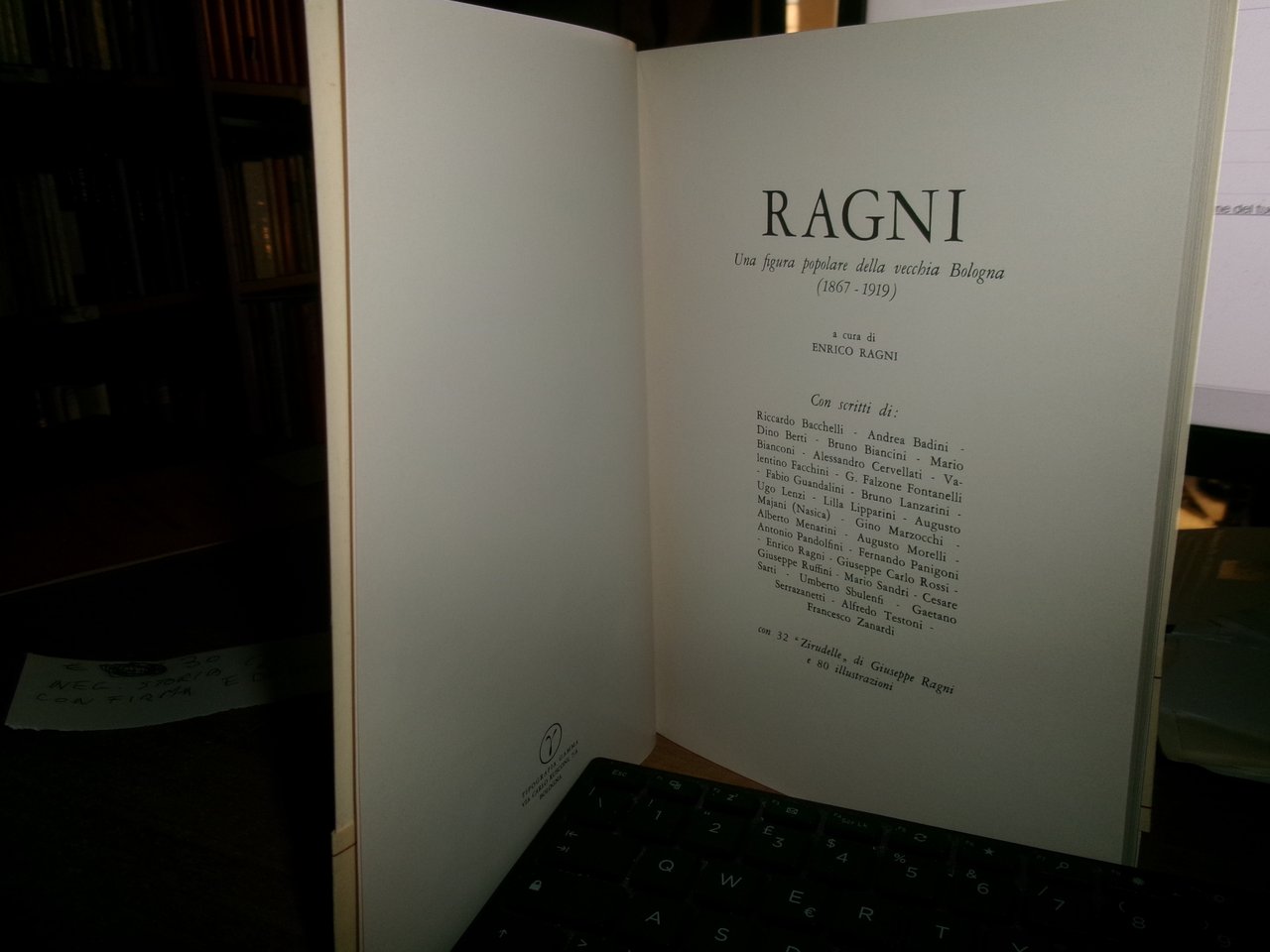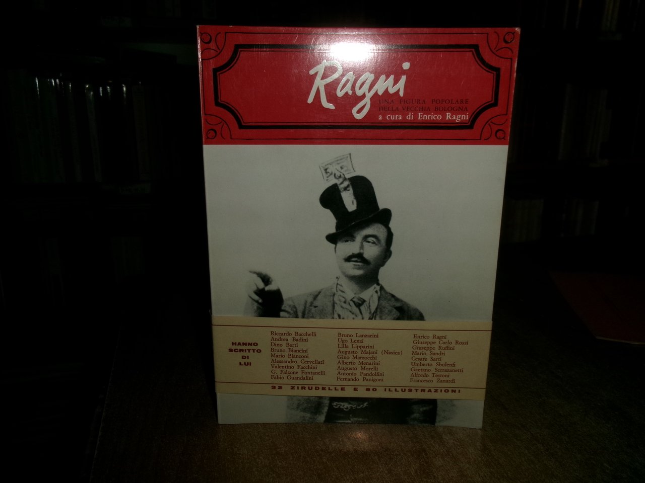 Enrico RAGNI (a cura di) – Ragni Una figura popolare della vecchia Bologna (1867-1919). Bologna, Tipografia Gamma, 1969. Enrico RAGNI (a cura di) – Ragni. Una figura popolare della vecchia Bologna (1867-1919). Con scritti di: Riccardo Bacchelli, […] Francesco Zanardi. – 1969. ; Brossura editoriale figurato con titoli al piatto e dorso(fascetta alla brossura); In-8°, cm 23.9; 1.vol; Pagg. 160; Testo stampato su carta patinata con 80 illustrazioni b/n n.t…Come nuovo con fascetta e dedica firmata dall' Autore in antiporta. Neg. storia 2 entro busta trasp.