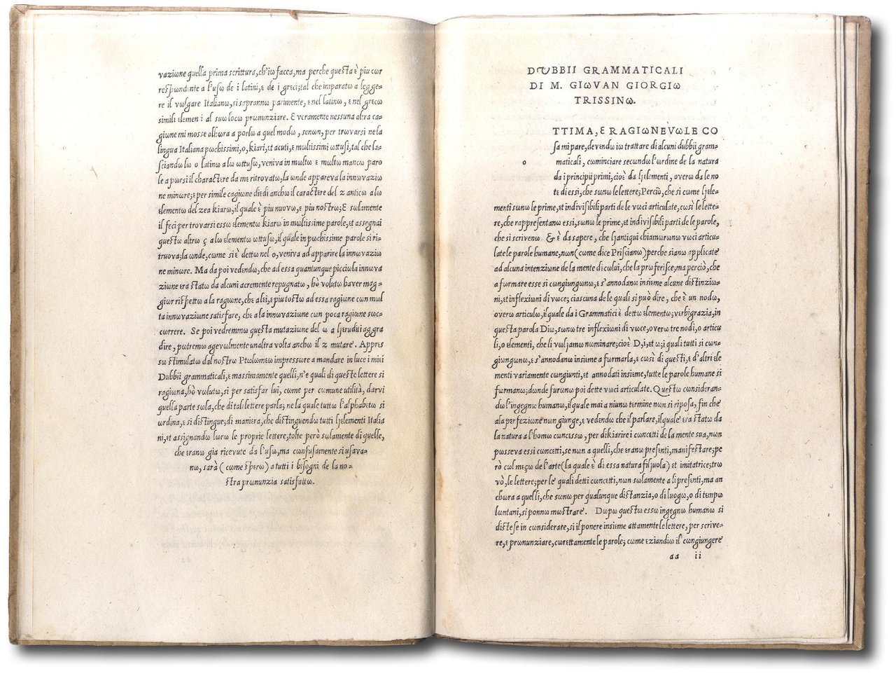 >in-folio (mm 280x186), ff. (17 su 18 mancando l'ultimo bianco, segn. A4, aa-bb4, cc5), leg. in cartonato rustico antico. Impresa tipogr. al titolo., spazi con lettera-guida per le iniziali, testo nel caratteristico stupendo corsivo dello Janiculo. Seconda edizione con qualche modifica rispetto alla prima (apparsa a Roma nel 1524) di quest'importante e curiosa opera del Trissino (Vicenza 1478 - Roma 1550) sulla riforma dell'ortografia italiana, con la proposta di adottare alcune nuove lettere mutuandole dall'alfabeto greco. La ''Epistola'' è indirizzata al Papa Clemente VII. Al recto del sesto foglio (aa2) iniziano i ''Dubbi grammaticali'', qui in edizione originale, che costituiscono la parte preponderante dell'opera. Gamba 1704: «A questa ristampa è anteposto un Proemio di T. Janiculo, in cui si scrive che l'Epistola è stata in qualche particella dall'Autore fatta più lucida e chiara; il che è verissimo. I Dubbi grammaticali aggiuntivi furono dall'autore scritti per puntellare le sue nuove opinioni contro le censure del Firenzuola, del Liburnio, del Tolomei, e di Lodov. Martelli. Il Trissino restò vinto da' suoi avversari; ma non totalmente, poiché rimasero almeno nella nostra ortografia adottate le differenze da lui suggerite dell'i e dell'u, vocali, dal j e dal v, consonanti». Opera di notevole fascino e molto rara. Esempl. molto bello, a grandi margini su carta forte. Gamba Test di Lingua, 1704. STC 681. Adams T-951.
