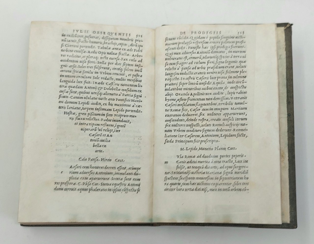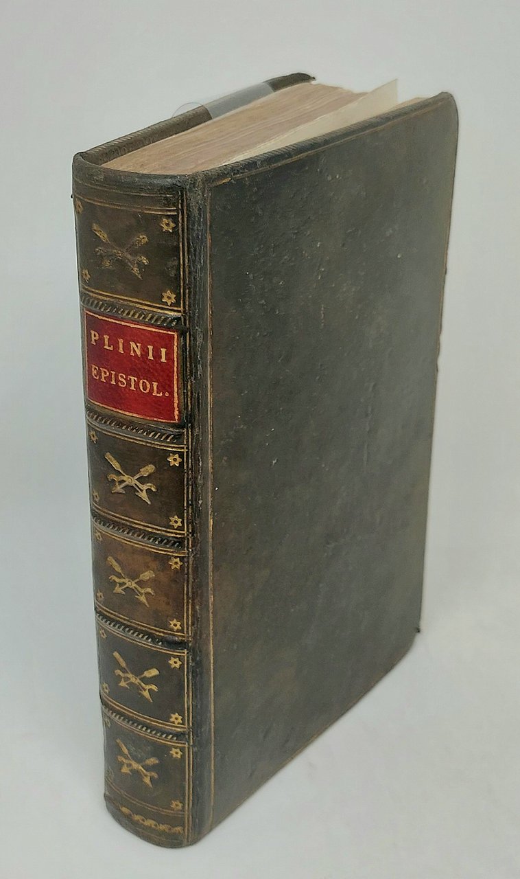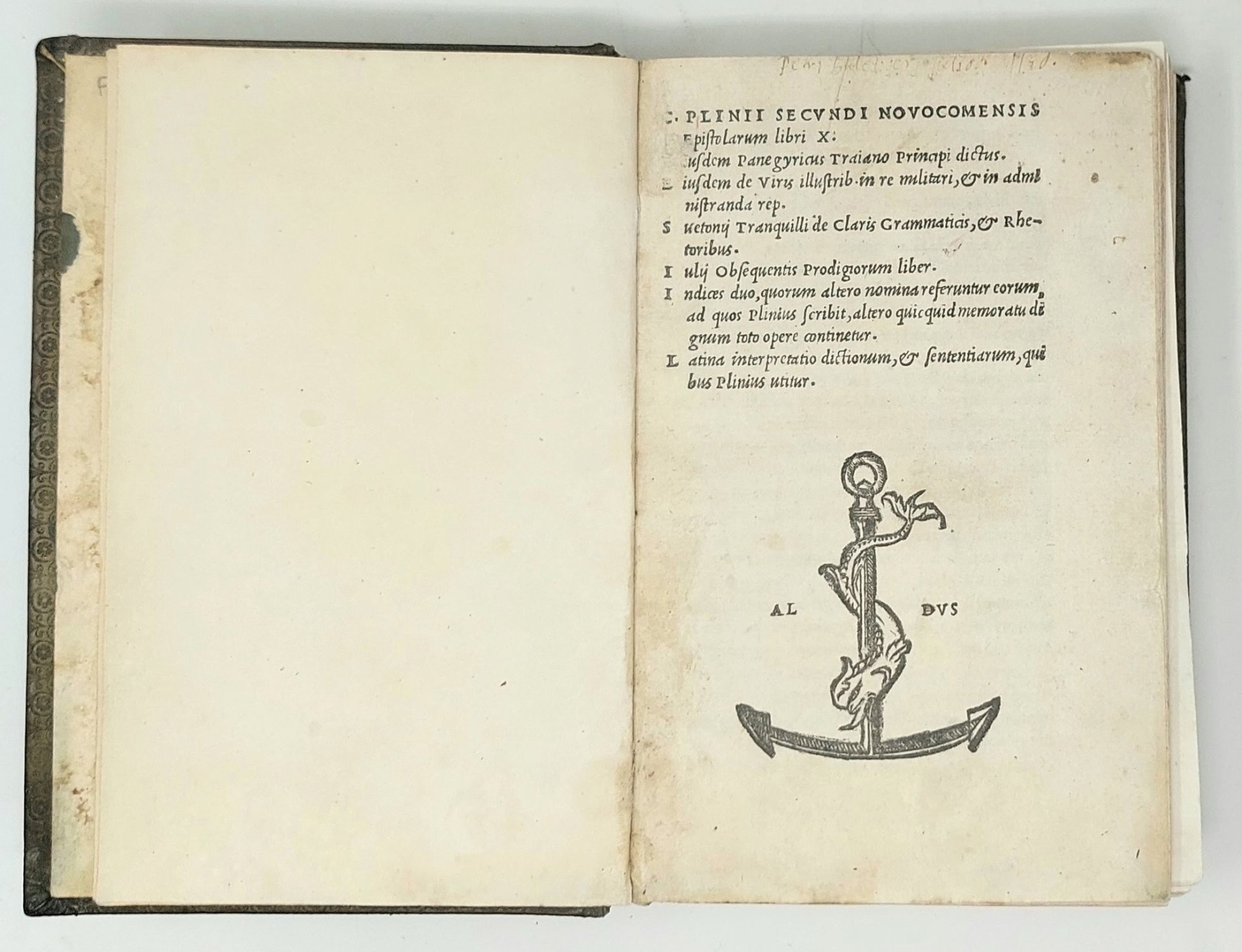>in-8 (148x93 mm), ff. (26, su 28, mancando gli ultimi 2 bianchi), pp. 525, (1 foglio con àncora al verso). Elegante legatura 800sca in piena pelle verde oliva, riquadro a filetto oro sui piatti, dorso a nervi con tassello in pelle rossa e negli scomparti emblema oro di Carlo L. Fitzgerald (che nel 1840 aveva ricevuto in premio il presente libro, come da attestato applicato nel contropiatto). Titolo con àncora aldina, ripetuta in fine; carattere corsivo, spazi con lettera-guida per le iniziali. Seconda edizione aldina, ristampa della prima del 1508, con la stessa lunga dedica di Aldo ad Alvise Mocenigo e con la stessa curiosità della numerazione delle pagine impressa sempre in alto a destra, in modo che al verso viene a trovarsi nel margine interno, e preceduta, ma solo in alcuni casi fino a pag. 32, da parentesi tonda. Rispetto alla prima, tuttavia, quest'edizione ha in più il ricco ''Index rerum memorabilium'' e la ''Latina interpretatio dictionum et sententiarum graecarum'' (ff. 12-26 preliminari). Oltre l'Epistolario completo di Plinio il Giovane, il volume contiene anche il ''Panegyricus Traiano'' ed il ''De viris illustribus'' del medesimo, il ''De claris grammaticis et rhetoribus'' di Svetonio ed il ''Prodigiorum liber'' di Julius Obsequens. Esemplare assai ben conservato. Renouard p. 82.1. UCLA II, 145. Adams P-1538. BMC 525.