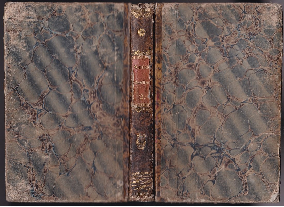 - Marmorierter Pappband der Zeit mit goldgeprägtem rotem Rückenschidchen und goldgeprägtem Rückendekor. Gelbschnitt.
