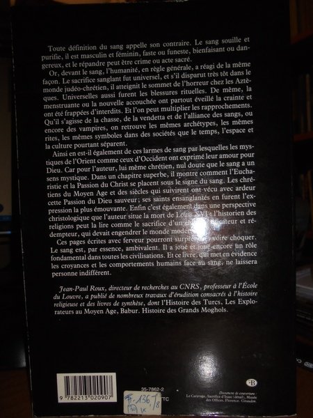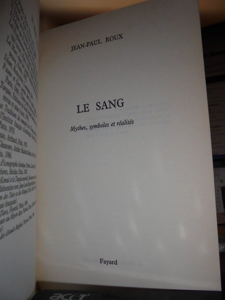 Jean-Paul Roux. France, Fayard, 1988. Le sang. Mythes, symboles et réalités. In-8°, cart. edit. 407, (1) pp. Ben conservato. Uff. stanz. TV
