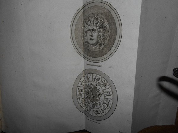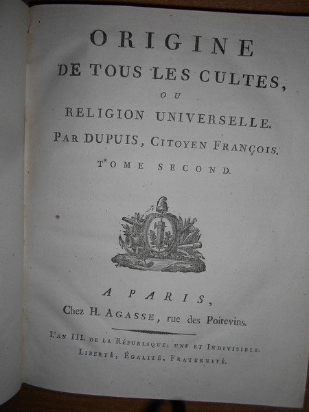 (Esoterismo) DUPUIS, Citoyen François. A Paris, Chez H. AGASSE, rue des Poitevins, s.d. (1795). ORIGINE de Tous les Cultes, ou Religion Universelle. First edition. 4 volumi in-4°, piena pelle maculata coeva, fregi e titoli in oro entro tasselli a i dorsi, (1-3 text + plates). I. xvi, iv, 326+329-556 (=554) pp.; II. (iv), 280+291-302 (=292), 304 pp. III. (iv), 367, (1), 335, (1), 104 pp., 3 folding tables. IV. 16 pp., beautiful allegorical frontespice finely engraved by L. Pauquet, and P.H. Trierè, and 22 (19) folding engraved plates. Bellissimo esemplare. Neg. esot. in alto mob. 101 entro sach. rosso.