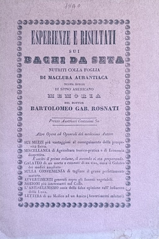 ESPERIENZE E RISULTATI SUI BACHI DA SETA NUTRITI COLLA FOGLIA DI MACLURA AURANTIACA