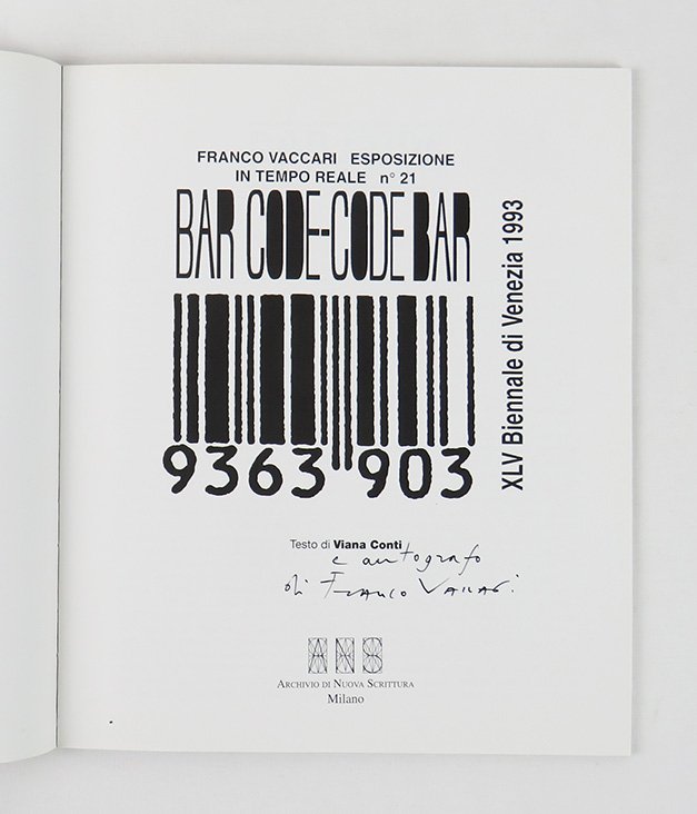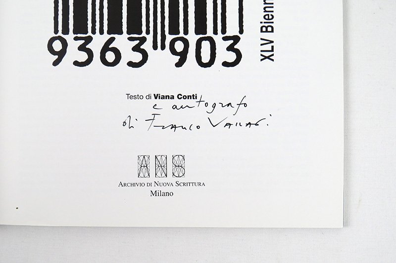 LIBROEdizione originale.CON AUTOGRAFO.Eccellente esemplare pregiato da divertente intervento autografo dell’autore, che al frontespizio, subito a seguire la nota «testo di Viana Conti» aggiunge: «e autografo di Franco Vaccari».Raro catalogo / libro d’artista che nasce dalla performance alla 45sima Biennale di Venezia.