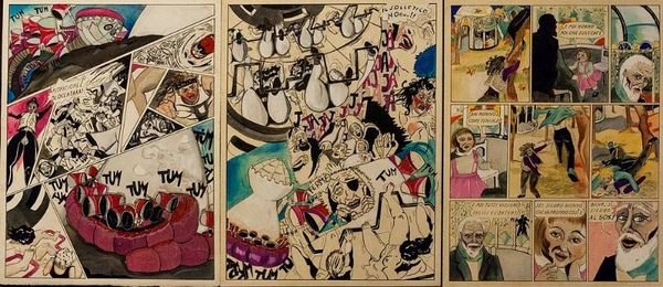 Storia completa a trama fantascientifica su 9 tavole disegnate e colorate a mano, firmate 'Sitaro' e sotto firma 'Raffela Daniel'. Tavole su carta pesante , cm. per foglio, 45x35, molto belle e decorative. Firma e numerazione sul retro di ogni tavola. Qualche traccia del tempo ma ottimo stato di conservazione.