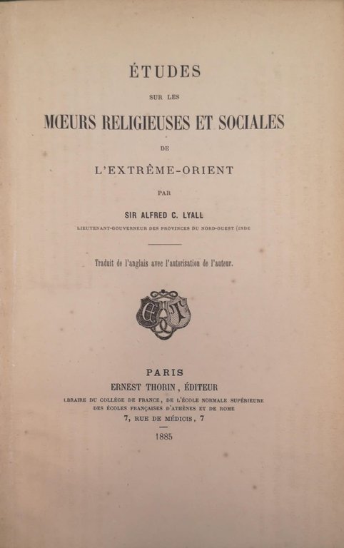 ETUDES SUR LES MOEURS RELIGIEUSES ET SOCIALES DE L'EXTREME-ORIENT. - Traduit de l'anglais.