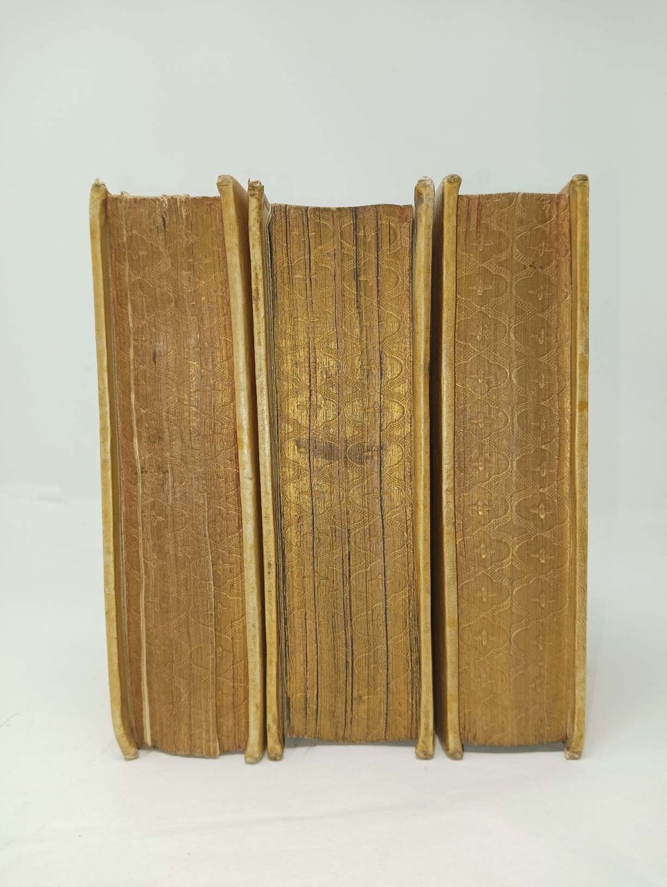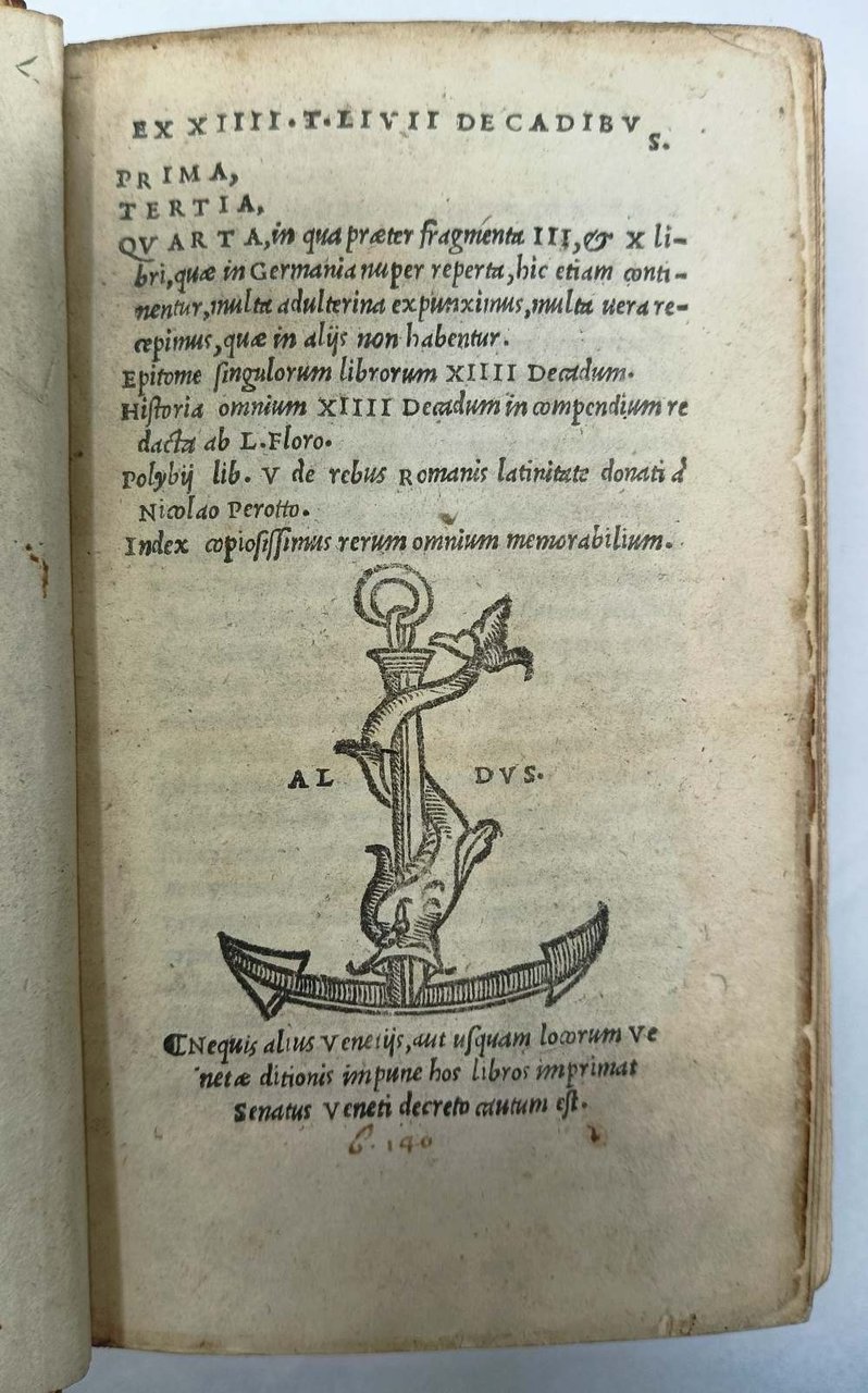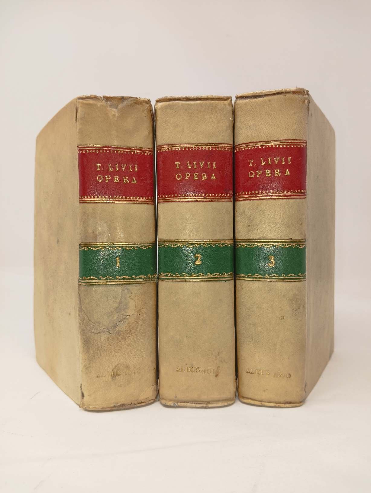 >3 voll. (159x95 mm)in-8 , ff. (74, mancando 2 bianchi), 365 (ma 363, salto di numeraz. 190-193), (7); ff. (55, mancando 1 bianco), 350, (6); ff. (43, mancando ultimo bianco), (10, mancando 2 bianchi), 296; completi in 1204 ff., mancando i 6 ff. bianchi. Ancore aldine incise ai 3 frontespizi, all'inizio degli 3 indici di ciascun volume e sull'ultimo foglio del primo e terzo volume. Eleganti legature omogenee di fine 700 in pergamena, con tit. in oro su duplice tassello verde e rosso, tagli dorati e cesellati. Primi tre volumi della prima edizione aldina di Livio (l'epitome di Floro e le aggiunte di Polibio uscirono nel 1521, il quinto vol. nel 1533). È impresa ardua reperire i 5 volumi insieme, ed in legatura omogenea. I tre volumi riportano la dedica ad Andrea Navagero, G.B. Ramusio e G.B. della Torre; Nella prefazione ai lettori della prima parte, Gianfrancesco d'Asola si lamenta delle contraffazioni che alcune officine poco scrupolose avevano stampato, con chiare allusioni ai Giunta ed a Froben; e vi annuncia l'importantissimo Indice che seguiva, contenente i nomi dei re, dittatori, consoli, pretori e altri personaggi; la compilazione era stata intrapresa da Giovanni Malatesta, mantovano e monaco Cassinense. Cataldi Palau p. 130: ''L'indice figura in ognuno dei volumi di Livio. Costituisce quasi una parte a sé, come sembra indicare la marca di stampa che vi è premessa, diversa da quella che si trova all'inizio ed è ripetuta alla fine del testo''. Esemplari freschi e in ottimo stato di conservazione (lievissimi aloni di polvere sul primo e sull'ultimo f.). Abilmente riprodotti su carta antica i primi due fogli del 2° volume contenenti l'inizio dell'”Index decadis tertiae”. UCLA 151, 155. Renouard 83.7, 86.5, 89.5. Dibdin II, 165: The five volumes are of rare occurrence.