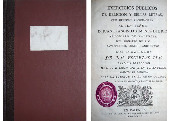 Exercicios Públicos de Religión y Bellas Letras que ofrecen y consagran al Ilustrisimo Señor Don Juan Francisco Ximenez del Río, Arzobispo de Valencia, los Discípulos de las Escuelas Pías baxo la direccion del Padre Ramón de San Francisco, Maestro de Retórica. | Rare and modern books | San Francisco, Ramón De. (Editor).