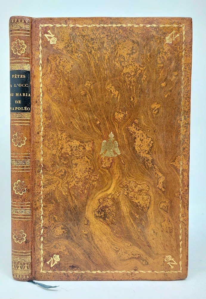 >in-8 (210x130 mm), pp. 48 di testo, 54 incisioni in rame (di cui 1 ripiegata) fuori testo illustranti ogni aspetto della cerimonia delle nozze dell'Imperatore Napoleone. Legatura dell'epoca in pieno vitello marmorizzato, fregi floreali e filetti in oro al dorso, titolo in oro su tassello in pelle, bordura vegetale in oro e lettera N con corona agli angoli interni, al centro aquila imperiale ad entrambi i piatti,tagli marmorizzati e dentelle interna. Pregiato e raro cimelio coevo su Napoleone Bonaparte, perfettamente conservato. Ruggeri, Libri diFeste, n.638.