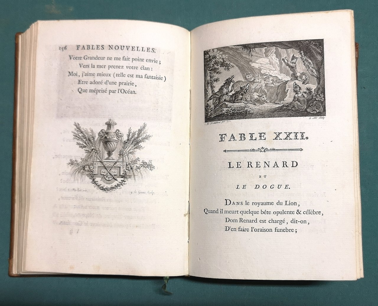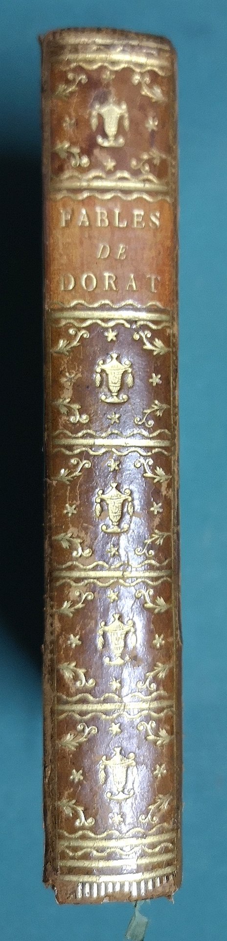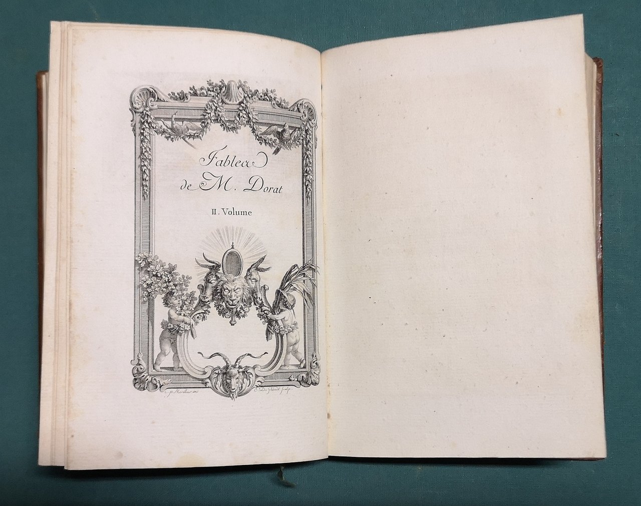 >2 voll. in 1 tomo in-8, pp. XXII, 308, 1 antiporta figurata, 2 frontespizi per ciascun volume (medesima tavola, ripetuta), vignetta al titolo, tavola di titolo entro cornice figurata del 2 volume; 99 vignette e 99 finalini (Mariller, Baquoy, Duflos, Lebeau, Lingée, de Longueil, Née, Ponce, etc). Legatura coeva in p. pelle, doppi filetti ai piatti, titolo e fregi in oro al dorso, tagli dorati. Edizione originale delle Fables. Prima tiratura. Le illustrazioni alle Favole di Dorat sono considerate il capolavoro di Mariller ed uno dei più notevoli libri illustrati del Settecento francese. Ottimo esemplare. Cohen-Ricci, 313.