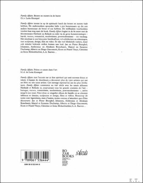Paperback met flappen, 230 x 265mm., 208pp., 150 illustraties in kleur ISBN 9789061536444. Tweetalige uitgave Nederlands en Frans. Jan en Pieter Breughel, Dirk en Frans Hals, Gustave en Ernst Klimt, Christine en Irene Hohenbuchler, Maik en Dirk Lobbert, Johannes, Ambrosius en Abraham Bosschaert, Antoine Pevsner en Naum Gabo, Giorgio De Chirico en Alberto Savinio, Marcel en Suzanne Duchamp, Alberto en Diego Giacometti, Koen en Frank Theys, L.A. Raeven. Broers en zussen nemen een bijzondere plaats in de kunstwereld in. Vrienden vinden elkaar door hun gemeenschappelijke interesses; broers en zussen groeien samen op. De bloedband en een gemeenschappelijke achtergrond drukken een nadrukkelijke stempel op de ontwikkeling van hun artistieke persoonlijkheid. Uitgebreid onderzoek naar deze relatie in de kunst leidde tot deze Family Affairs, een tentoonstelling en boek over de spirituele familieband die broers en zussen vaak hebben. De kunstenaars gaan niet gebukt onder onderlinge rivaliteit zoals men misschien zou verwachten. Broers en zussen treden vaak als eenheid naar buiten en brengen een gemeenschappelijk werk voort vandaar ook de titel: Family Affairs. Van de achtste-eeuwse zussen Herline en Relinde in het klooster van Maaseik langs de grote schilderscholen van de moderne tijd tot aan de videokunst van de 21ste eeuw. Als broeder of zusterparen samen kunst maken, dan is het geheel meer dan de som van de delen. Wordt het artistieke talent bepaald door het sociale milieu of door de genen? Family Affairs zoekt het antwoord. Nieuw.