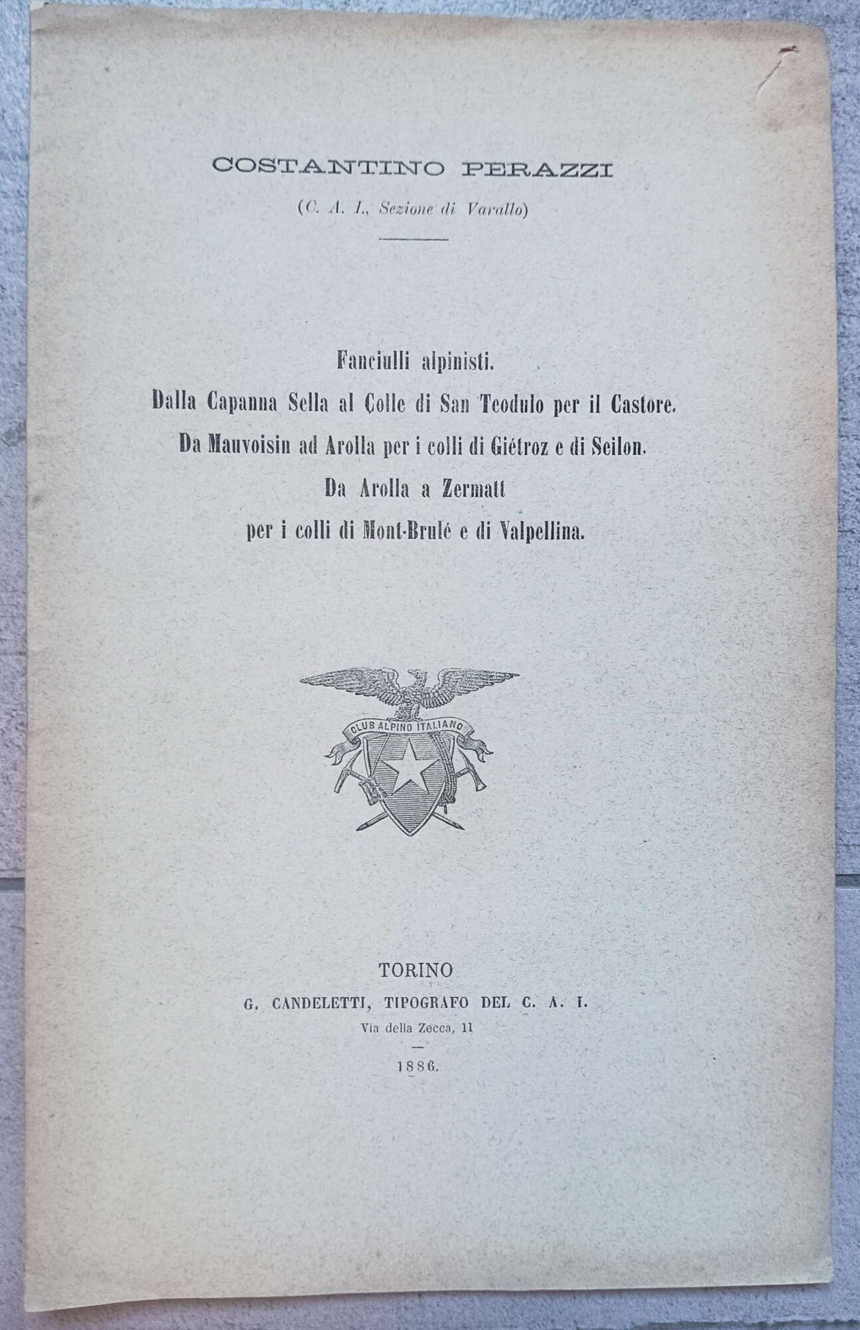 >in-8 (mm 238x149), pp. 8, brossura editoriale con stemma del C.A.I. al piatto superiore. Perazzi, alpinista appassionato e compagno di Sella nelle escursioni nel gruppo del monte Rosa, fu tra i fondatori del Club Alpino Italiano creato nel 1863 a Torino. Estratto dalla Rivista Mensile del Club Alpino Italiano, anno 1886. "Dalla Capanna Sella al Colle di San Teodulo per il Castore. Da Mauvisin ad Arolla per i colli di Giétroz e di Seilon. Da Arolla a Zermatt per i colli di Mont-Brulé e di Valpellina". Dedica ms dell'autore al frontespizio. "(...) non solo è utile per formare il carattere del fanciullo, ma giova alla salute del medesimo, condurlo su per le nostre Alpi, su per i ghiacciai e sui colli più alti". Ben conservato.