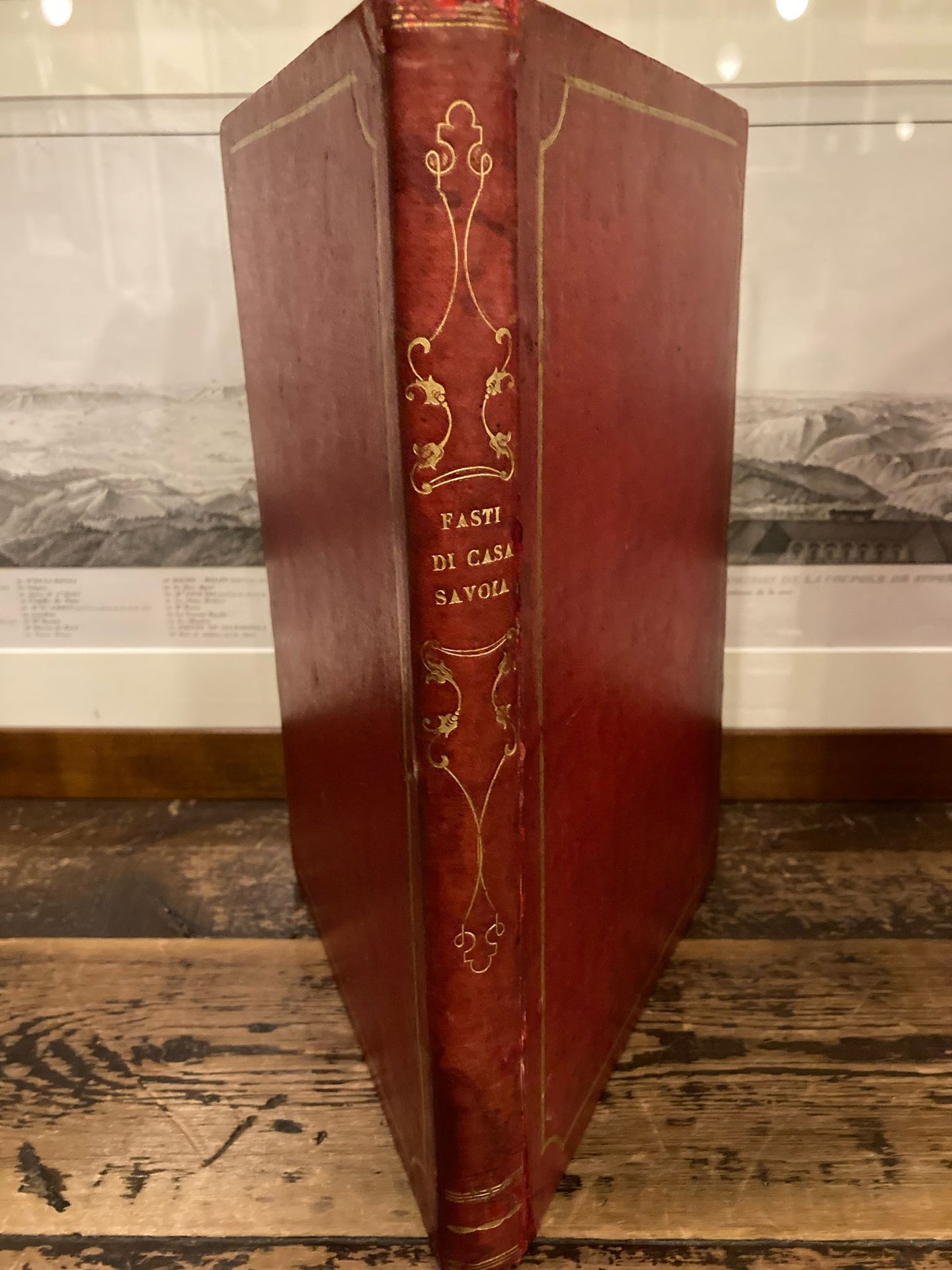 In-folio antico (31x23 cm), pp. VII (1) 104, bella legatura in pelle granata con titoli e fregi dorati al dorso, piatti riquadrati da cornice dorata. Conservato l'occhiello. Frontespizio e testo impressi entro duplice filetto tipografico e montati su brachette. Complessive 26 tavole f/t finemente incise su acciaio da Rouargue, Darenport e disegnate da Zino da invenzioni di Gonin, Cusa, Bisi, Storelli, ecc.; capolèttere ornati. Lievi difetti ad occhiello, controfrontespizio e frontespizio; lievi arrossature marginali ad alcune pagine. Malpaginazione di circa 10 pagine, ma volume completo. Più che buon esemplare. Edizione originale, rara, di questa encomiastica descrizione dei fasti della dinastia sabauda, accompagnata da suggestive incisioni; l'opera apparve a dispense nel 1845-1846 (per la data di edizione, cfr. De Gubernatis, Diz. biogr. degli scrittori contemp., p. 1023). Vallauri (Chiusa Pesio, Cuneo, 1805-Torino, 1897) fu professore di eloquenza latina e italiana nell'ateneo torinese, deputato, senatore dal 1882 nelle file cattoliche e filologo classico, curatore di edizioni di Plauto, Orazio, Cicerone, ecc. Manno, I, 62. Cfr. Tommaso Vallauri nella società e nella cultura dell'Ottocento, a cura di Giuseppe Griseri, Cuneo, 1999.