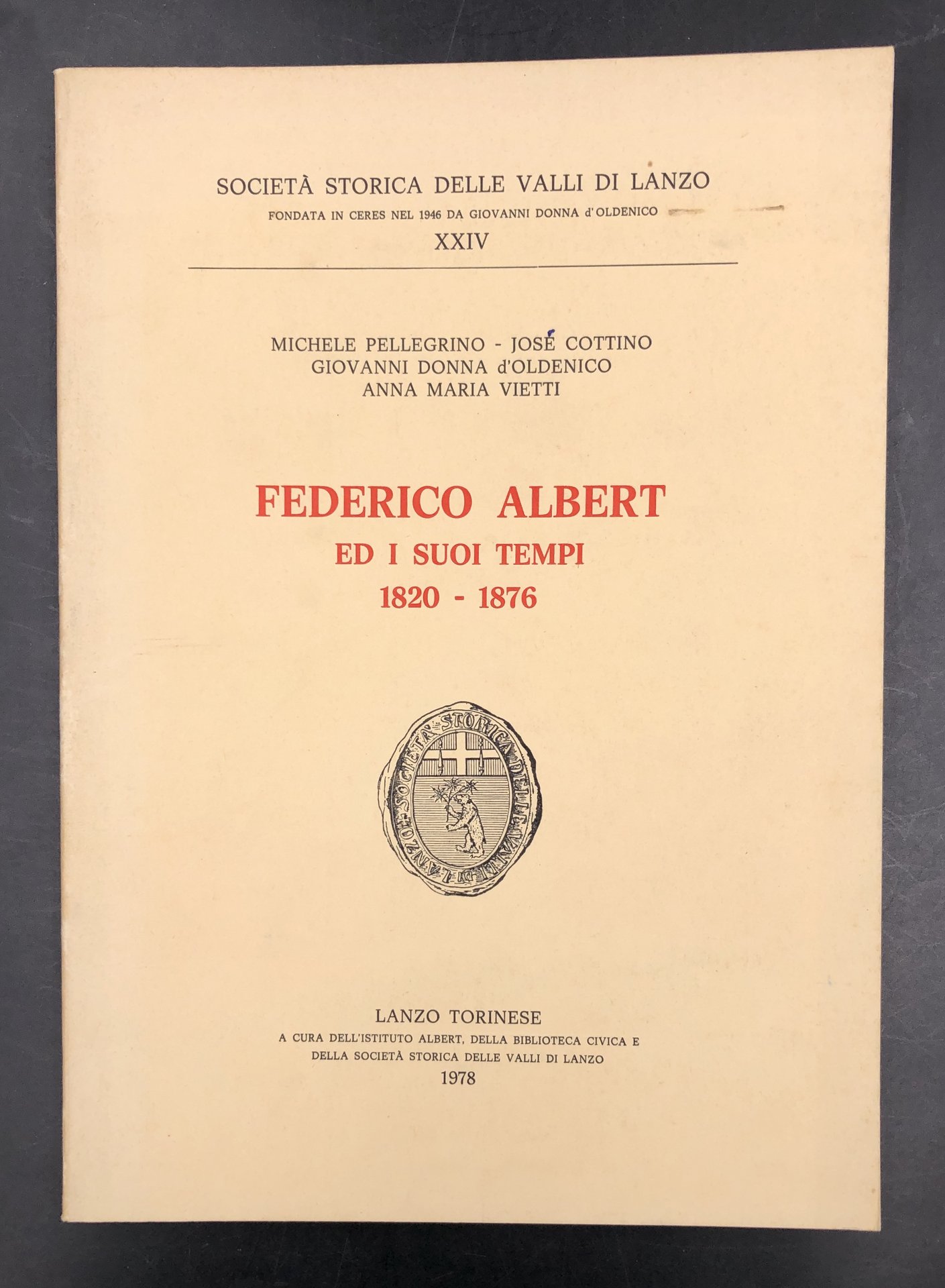In-8° (cm. 24x17), pp. 79, (1), cartoncino leggero editoriale.Scritti di Michele Pellegrio, José Cottino, Giovanni Donna d'Oldenico, Anna Maria Vietti sul presbitero ALBERT (Torino 1820 - Lanzo Torinese 1876), collaboratore di Don Bosco, poi parroco di LANZO, promotore dell'istruzione e del ricovero di bambini e ragazze abbandonate, fondatore delle Suore Vincenzine di Maria Immacolata; proposto vescovo, rinunciò per proseguire la sua opera a Lanzo. È stato beatificato da papa Giovanni Paolo II nel 1984.