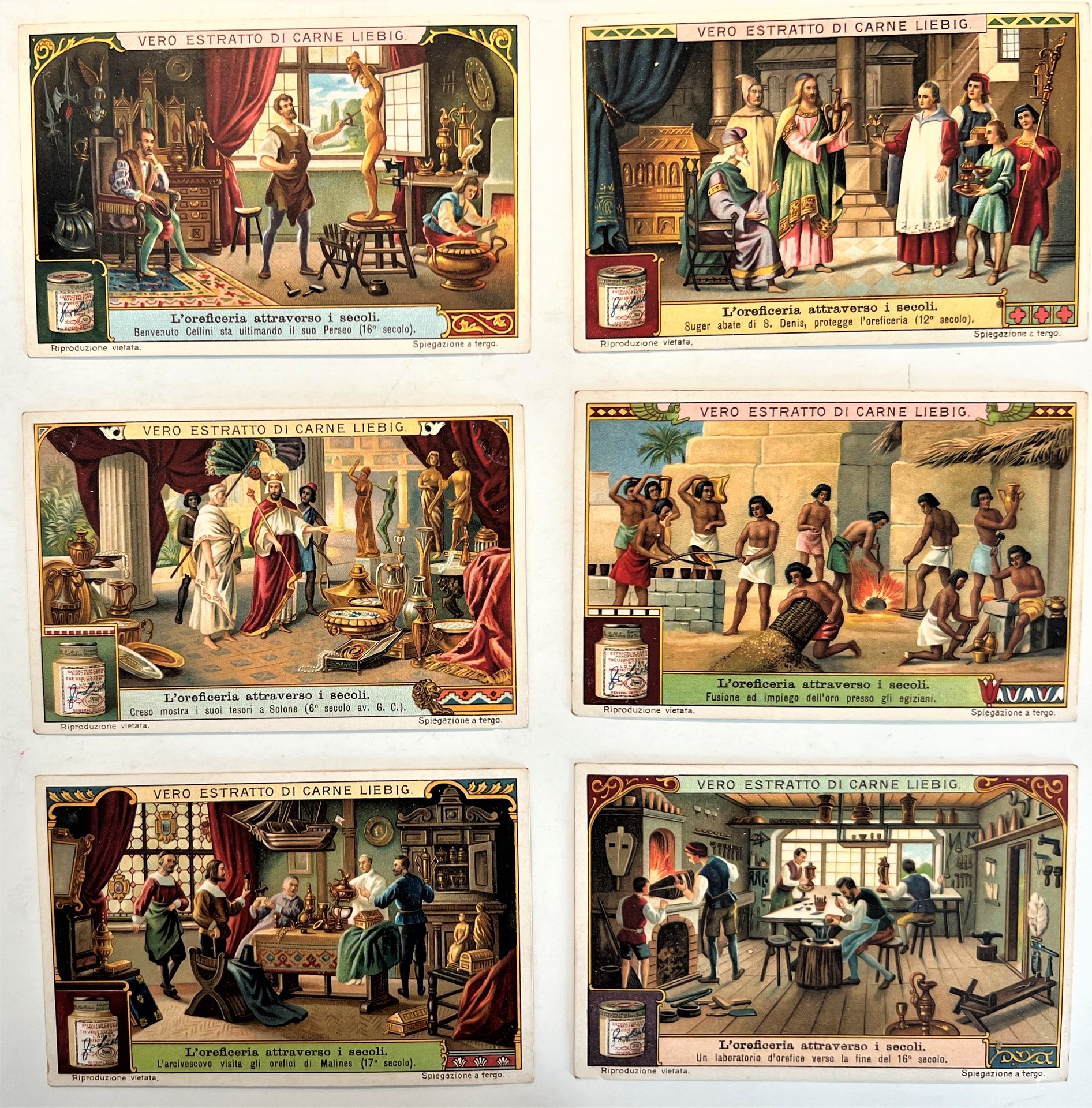 Figurine LIEBIG - L'Oreficeria attraverso i secoli - Rif. N° 1097 - 6 Figurine La numerazione fa riferimento al Catalogo Sanguinetti - FOTOGRAFIE DEL RETRO A RICHIESTA. Condizioni molto buone con piccoli segni del tempo come da foto.
