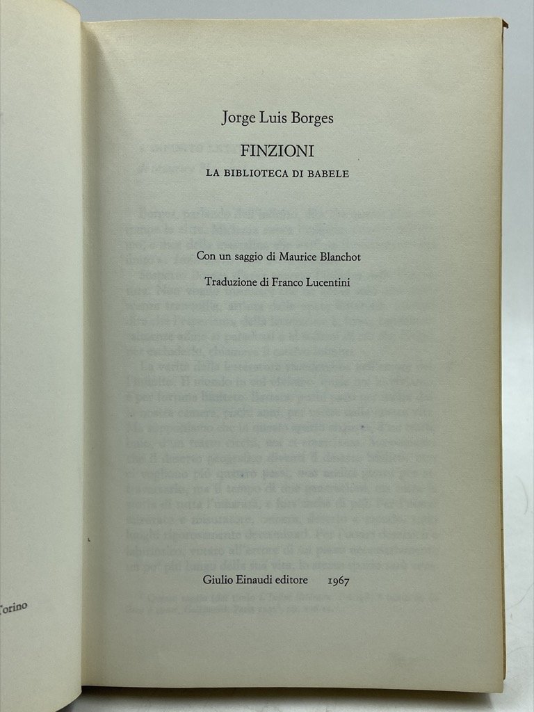 Tela editoriale con sovraccoperta, cm 18.5 x 12, pp XVI 148 (12). Collana N.U.E. Nuova Universale Einaudi, numero 84. Dedica a penna sulla prima sguardia, sovraccoperta leggermente brunita. Terza edizione italiana, e prima nella collana NUE, di uno dei più celebri libri di Borges, con alcuni dei più folgoranti racconti dell'immaginifico scrittore argentino, come «Tlon Uqbar Orbis Terius», «La lotteria a Babilonia» e «La biblioteca di Babele». La raccolta comprende racconti scritti tra il 1935 e il 1944 e riuniti in due parti: la prima, Il giardino dei sentieri che si biforcano, apparve nel 1941 e la seconda, Artifici, nel 1944 quando il libro fu pubblicato con il titolo definitivo di Ficciones dalle edizioni SUR. In Italia l'opera fu pubblicata per la prima volta nel 1955, nei Gettoni di Elio Vittorini, col titolo del racconto più noto, La Biblioteca di Babele, con traduzione di Franco Lucentini; la versione fu riproposta anche nell'edizione del 1961 nei Coralli, che recuperò il titolo originale di Finzioni, e in questa del 1964 nella NUE, arricchita del saggio di Maurice Blanchot «L'infinito letterario».