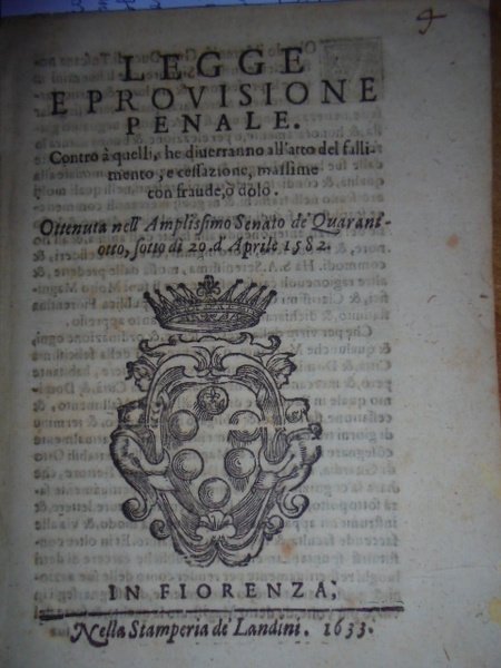 Bandi.LEGGE e PROVISIONE PENALE contro a quelli che diverranno all' atto del fallimento, e cessazione, massime con fraude o dolo. Ottenuta nell' Amplissimo Senato de' Quarantotto, sotto dì 20 d' Aprile 1582. In Fiorenza, nella Stamperia de' Landini, 1633. In-4° antico, cop. in varese. (8) pp. Arme ducale nel front. Opuscolo. Pac. 3. Uff. Mob. 3